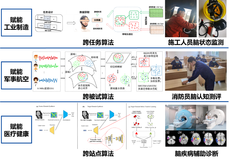 赋能工业制造,建立跨任务算法,实现施工人员脑状态监测;赋能军事航空,建立跨被试算法,实现消防员脑认知测评;赋能医疗健康,建立跨站点算法,实现脑疾病辅助诊断。